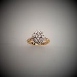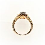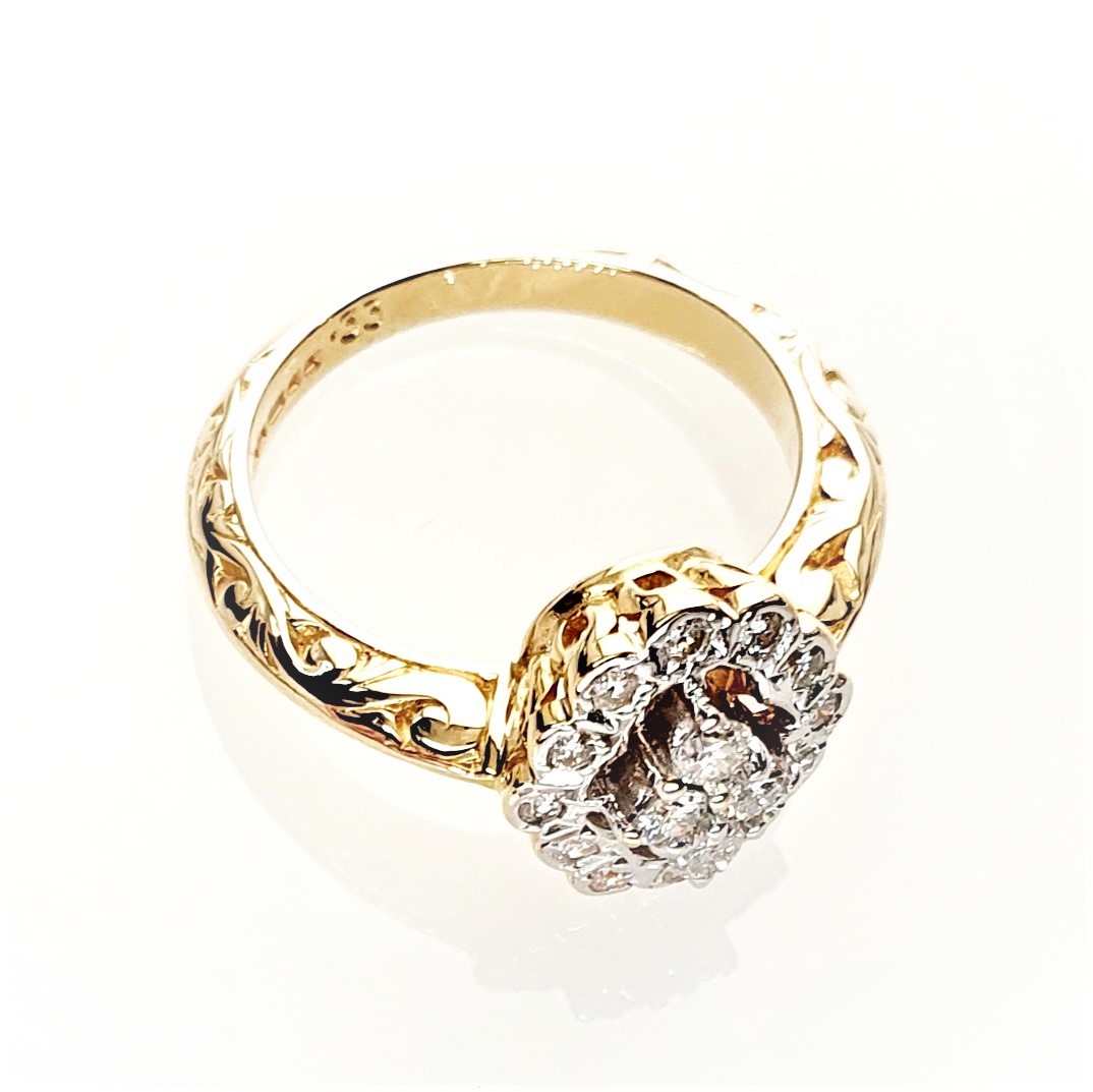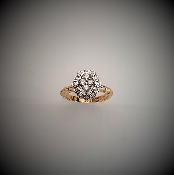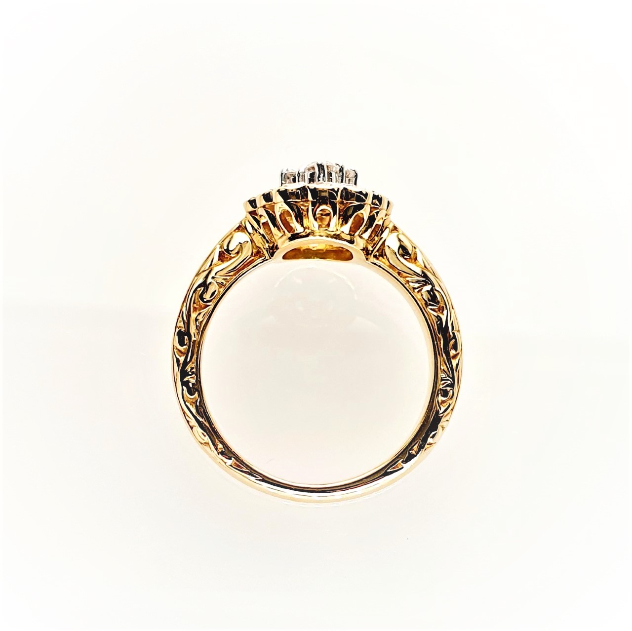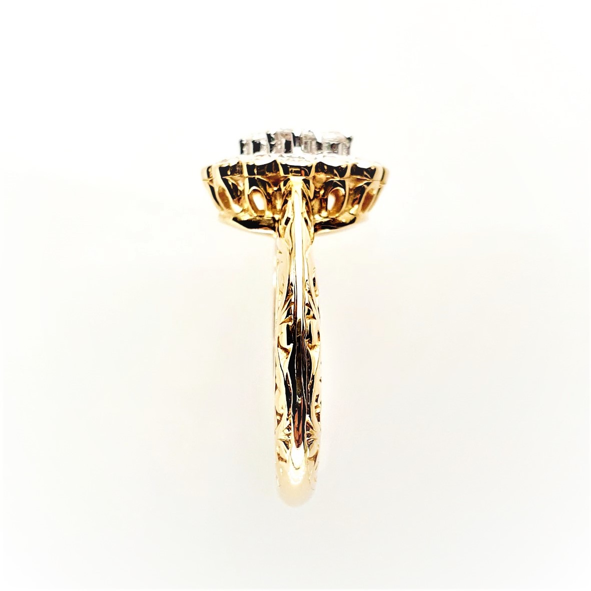A blast from the past, this gorgeous Victorian style diamond halo cluster ring has an ornately carved design to the sides, it is in excellent condition, made in Birmingham in 1985, it looks like it was made yesterday no signs of wear and tear.
