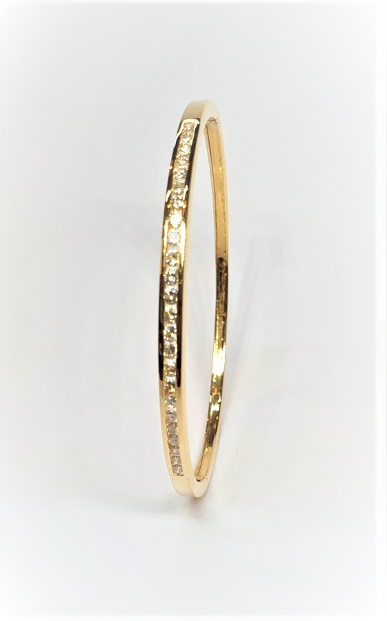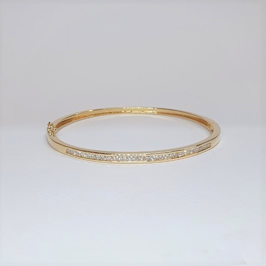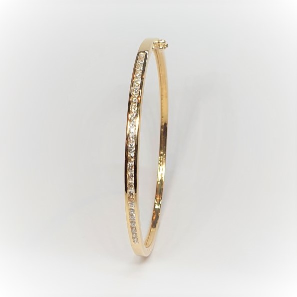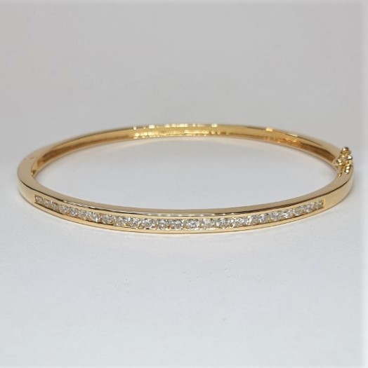 A stunning 18ct gold bangle with a modern contemporary look that will make her stand out in a crowd, channel set with a line of twenty-four round white sparkling diamonds to the top.