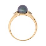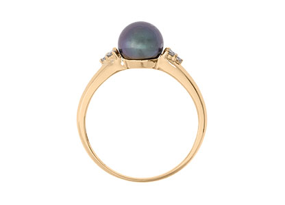 A sophisticated and elegant design with a timeless appeal. This 18ct yellow gold ring has a beautiful single black pearl centre, accentuated with three sparkling white round brilliant cut diamonds to each side, giving a perfect contrast of dark silky pearl and sparkling white diamonds.