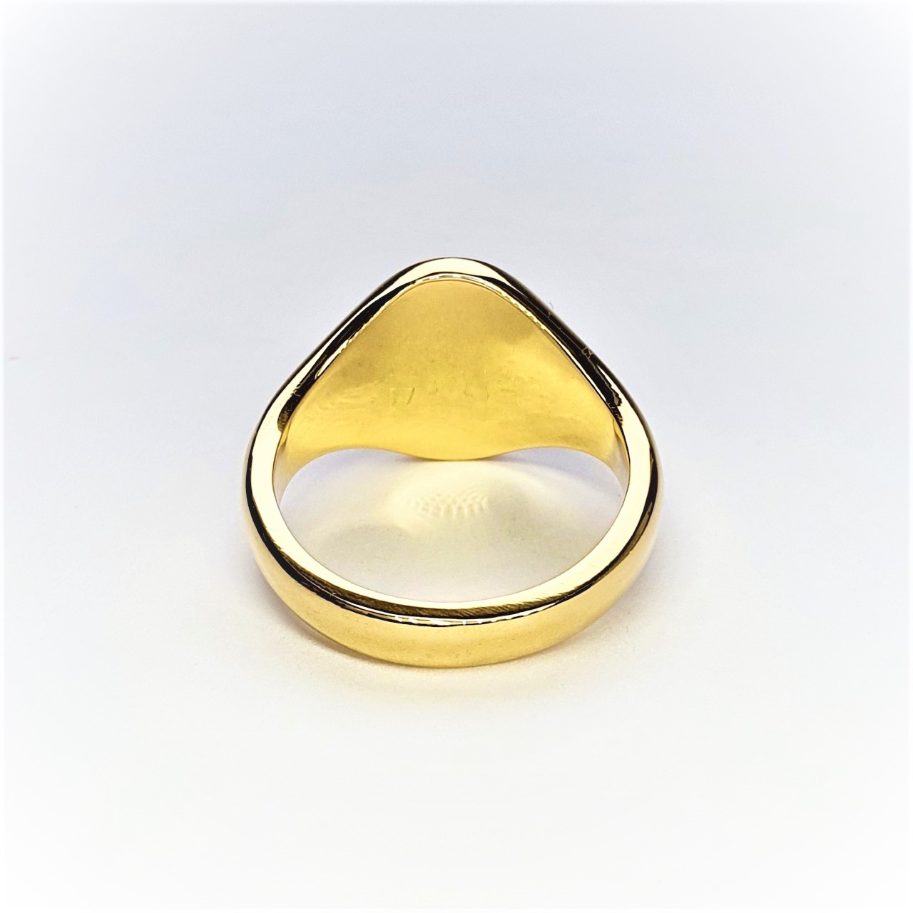Furthermore, explore the quality guarantee of this 18ct yellow gold oval signet ring. Thus, it bears a hallmark confirming legal purity standards.