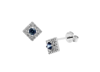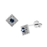 City of London Jewellers present these gorgeous 18ct white gold square stud earrings each Set with a single round blue sapphire centre, surrounded with round sparkling white diamonds.