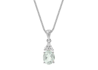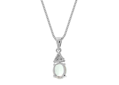 A graceful 18ct white gold necklace featuring a 6mm x 5mm oval aquamarine accented by three brilliant‑cut diamonds in a triangular design, suspended from a curb‑link chain. With its timeless elegance, this aquamarine pendant makes a truly lovely gift for life’s most cherished occasions.