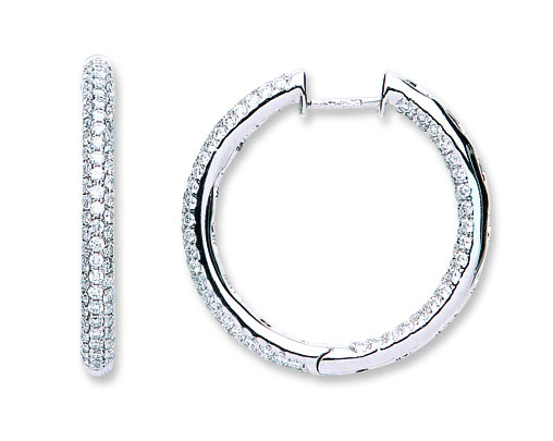 These graceful hoop earrings, are crafted in 18ct white gold. Set with 1.56cts of round brilliant cut white diamonds, chosen by our expert diamond buyer for their exceptional sparkle and fire, reflecting the light beautifully in every direction. Also set with diamonds on the inside back of the earrings which creates a dramatic effect that is both romantic and eye-catching and is sure to command attention wherever you go… for all the right reasons of course!