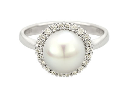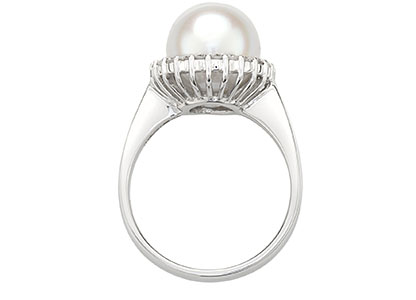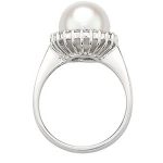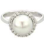 A gorgeous and sophisticated pearl and diamond cocktail ring, set with a large single smooth white cultured pearl centre and surrounded with twenty-two brilliant cut diamonds, specially chosen for their exceptional sparkle and fire and set in this unique style that captures light from every angle.