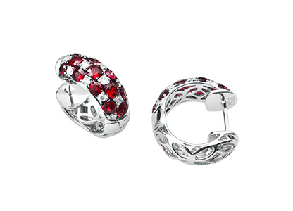 Absolutely stunning, these beautiful 18ct white gold diamond and ruby huggie hoop earrings are intricately crafted. The breath-taking checker pattern of diamonds and beautiful red rubies, complement each other to the point of perfection. Sure to be the crowning glory of any ensemble.