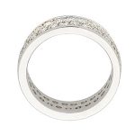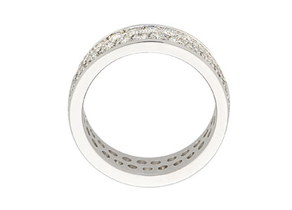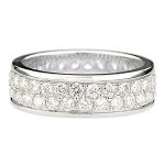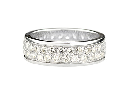 This beautiful sparkling full eternity ring is pave set with two rows of brilliant cut diamonds. These diamonds have been specially chosen for their exceptional sparkle and fire and are set in a style that captures light from every angle. This ring has an elegance that makes it exceptional.
