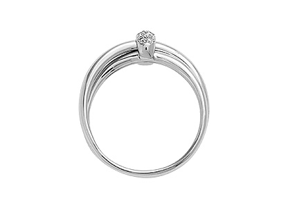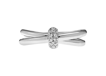 This chic contemporary 18ct white gold ring, features an eye catching, glistening, rectangular domed shape diamond encrusted top, presented on a dramatic polished split shoulder cross-over shank.