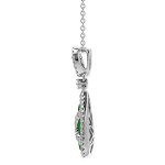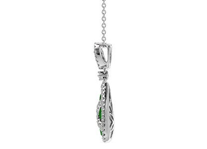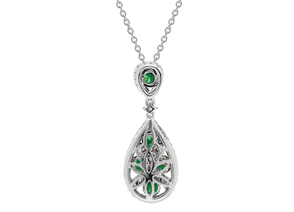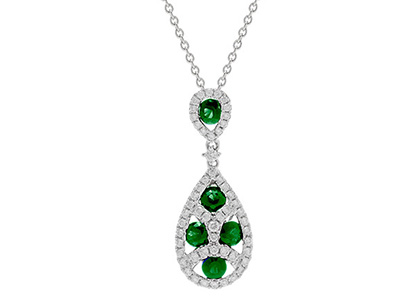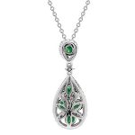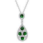 Absolutely stunning, this beautiful 18ct white gold diamond and emerald pendant and chain is intricately crafted. The breath-taking combination of diamonds and beautiful green emeralds, complement each other to the point of perfection. Sure to be the crowning glory of any ensemble.