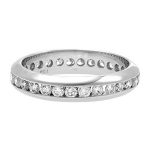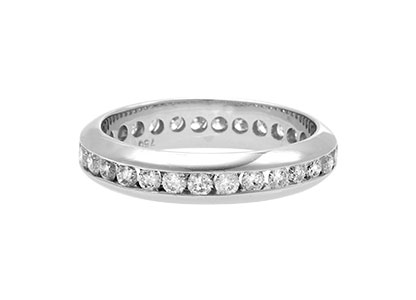 This tantalizing 18ct white gold full eternity ring, is channel set with a single central row of beautifully matched round brilliant cut sparkling diamonds, perfectly accentuated by the contrasting deep lustre of the polished white gold band around each side. A dramatic eye-catching feature symbolising eternal love that is sure to take her breath away.