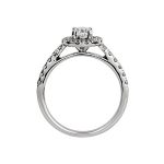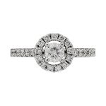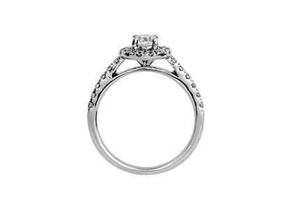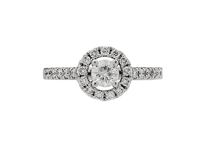 The beautiful round brilliant cut central round D colour diamond has a beautiful halo of diamonds leading onto the shoulders. These diamonds have been specially chosen for their exceptional sparkle and fire and set in a unique style that captures light from every angle, giving an elegance that makes it stand out.