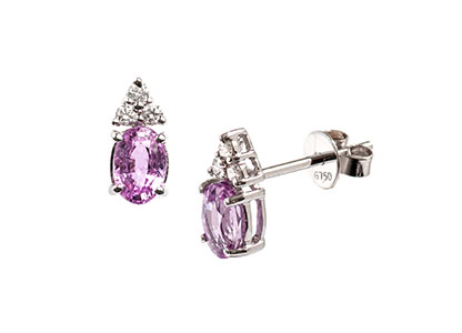 Simply beautiful, these luxurious 18ct white gold stud earrings are elegant and intricately crafted. Claw set with a precious oval pink sapphire and three round sparkling brilliant cut diamonds set at the top in the shape of a triangle, which creates a dazzling display of sparkling passion.