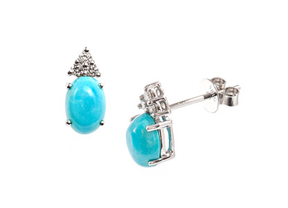 Simply stunning, these gorgeous 18ct white gold stud earrings are elegant and intricately crafted. Claw set with a pastel blue oval smooth cabochon cut turquoise and three round brilliant cut sparkling diamonds set at the top in the shape of a triangle, which creates a beautiful contrast of tranquil blue and dazzling diamonds.These gorgeous earrings are truly outstanding and have a sophisticated style that will never go out of fashion.