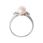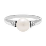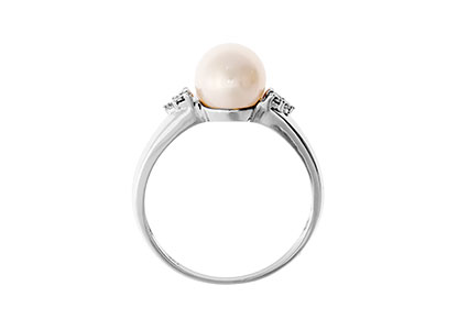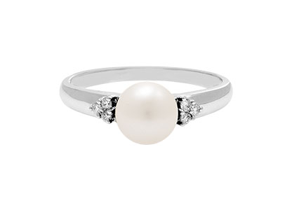 A sophisticated elegant design with a timeless appeal. A beautiful single snowy white pearl centre, accentuated with six sparkling round brilliant cut white diamonds.