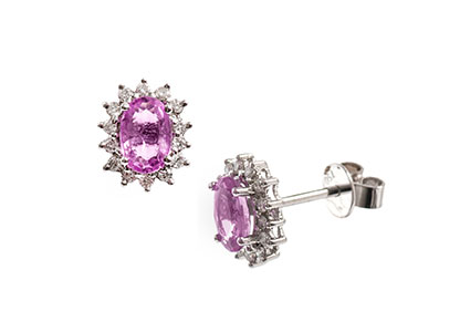 A timeless classic, these stunning 18ct white gold diamond and oval pink sapphire stud earrings are simply breath-taking. Claw set with a beautiful oval pink sapphire, surrounded by a glittering halo of fourteen round brilliant cut diamonds in each earring to create a dazzling display of sparkling pink passion.