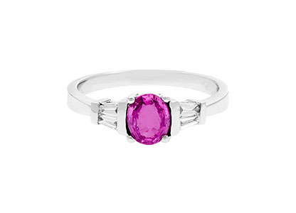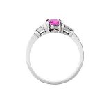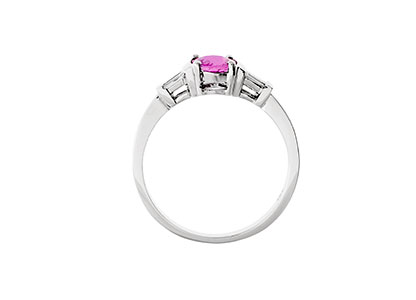 One oval brilliant cut pink sapphire 6mm x 5mm and four tapering baguette cut diamonds 0.18ct.