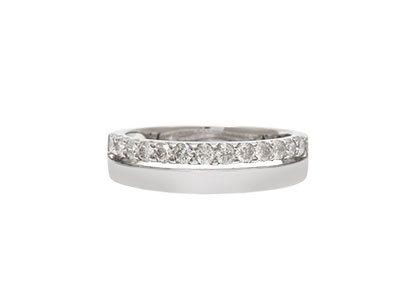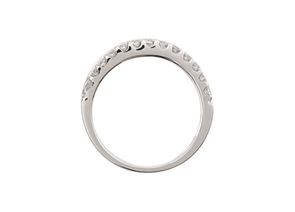 A beautiful 18ct white gold tapering band ring, claw set with thirteen round brilliant cut diamonds to one side, perfectly accentuated by the deep lustre of the polished white gold on the other side, with a very thin gap in between, to obtain the maximum possible light reflection. These diamonds have been perfectly matched and chosen for their exceptional sparkle and fire. This elegant design creates a dramatic eye-catching effect.