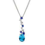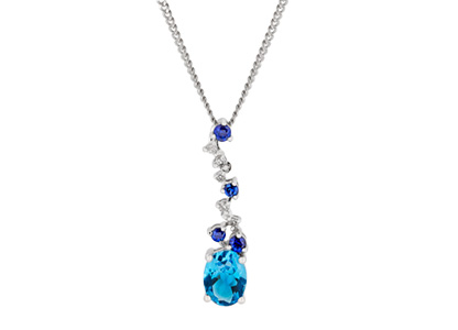 An Intriguing cascade of beautiful round blue sapphires leading to a contrasting gorgeous oval blue topaz , all brought together into an 18ct white gold abstract shape pendant interlaced with petite round white diamonds. This necklace will add a touch of colourful glamour to your look and make you feel great every time you wear it.