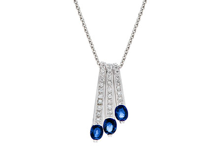 This pendant is created into three separate 18ct white gold graduating bars, encrusted with diamonds and accentuated with three oval sapphires. This breath-taking design has an unusual elegance that will turn heads with admiring glances. We are sure this pendant will become a long term favourite to your collection.
