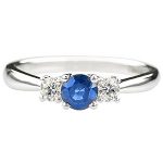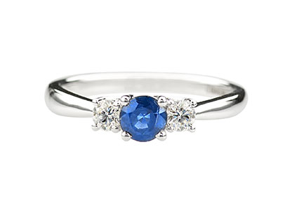 The three‑stone arrangement enhances its natural balance, featuring one 5mm round sapphire—associated with wisdom and calmness—set alongside two 3.2mm white brilliant‑cut diamonds totalling 0.26ct. Additionally, the composition captures light beautifully from every angle, giving the ring a graceful, uplifting presence.