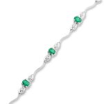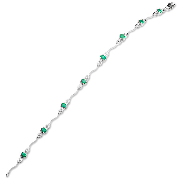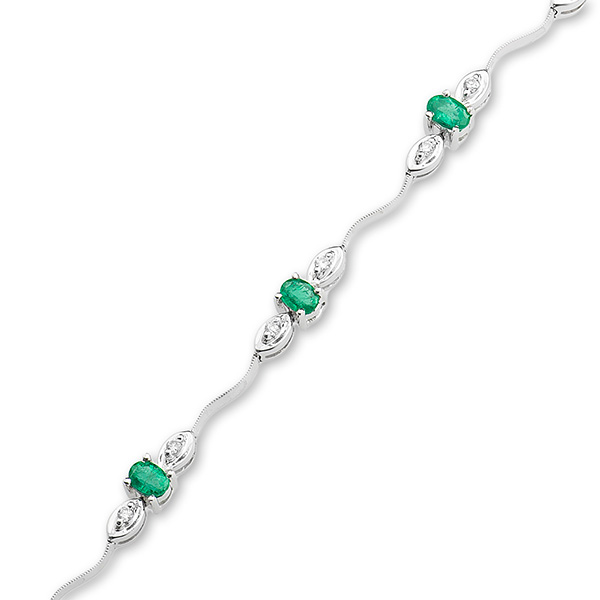 This gorgeous elegant 18ct white gold bracelet has nine trilogy sections. Each section is set with one oval emerald with one round diamond to each side, brought together with a single thin wave shape bar in-between. Each section has a moving joint to allow the bracelet to hug the ladies wrist. This creates beautiful feminine look.
