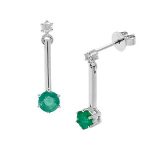 Crafted in 18ct white gold and gracefully suspended from a single round white diamond stud fitting, is a thin feminine sleek and stylish plain white gold bar design, leading to a beautiful round rich green emerald, a creative yet un-complicated style that will add a touch of colour to your outfit and look great, for both day or evening wear.
