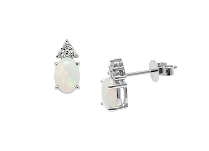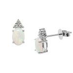 Simply stunning, these luxurious 18ct white gold stud earrings are elegant and intricately crafted to the highest standard. Claw set with a precious oval opal and three round brilliant cut sparkling diamonds set at the top of each earring into a triangular form, which creates a smart sophisticated style that will never go out of fashion and is sure to fire her passion.