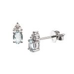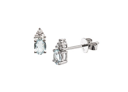 Simply stunning, these beautiful 18ct white gold stud earrings are elegant and intricately crafted, claw set with a pale blue oval aquamarine and three round sparkling brilliant cut diamonds, set at the top in the shape of a triangle. which creates a dazzling display of sparkling passion.