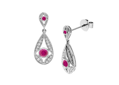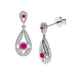 These Unique 18ct white gold pear shaped earrings are set with four gorgeous round blood red rubies and encrusted with white sparkling diamonds. A sophisticated design that would make a perfect gift for that special person, a gift that will take her breath away.