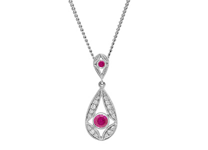 All of the gorgeous round brilliant cut white diamonds and the two beautiful rich red ruby stones are set into elegant milgrain settings which give a distinctive look, that will be the crowning glory of your special outfit.