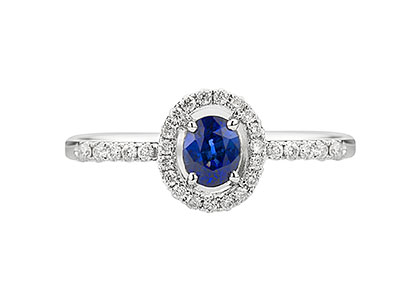 This beautiful oval sapphire has been perfectly framed by an oval halo of twenty-nine round brilliant cut diamonds following onto the shoulders.