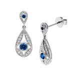 These Unique 18ct white gold pear shaped earrings are set with four gorgeous round blue sapphires and encrusted with white sparkling diamonds. A sophisticated design that would make a perfect gift for that special person, a gift that will take her breath away.