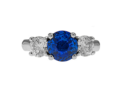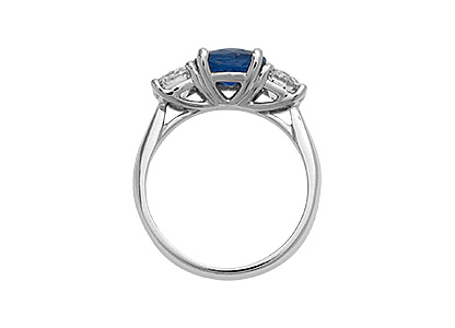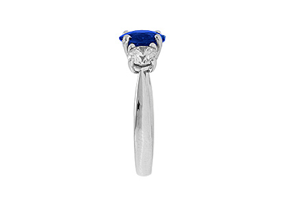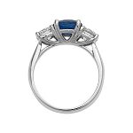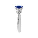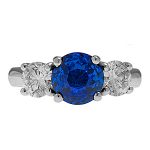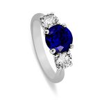 This stunning 18ct white gold sapphire and diamond three stone ring, is set to the centre with a gorgeous round brilliant cut sapphire weighing 1.77 carats and is probably the most rare and sort after shade of royal blue sapphire available. Complimented with a sparkling bright white diamond to each side, makes this elegant ring truly exceptional.