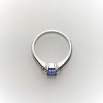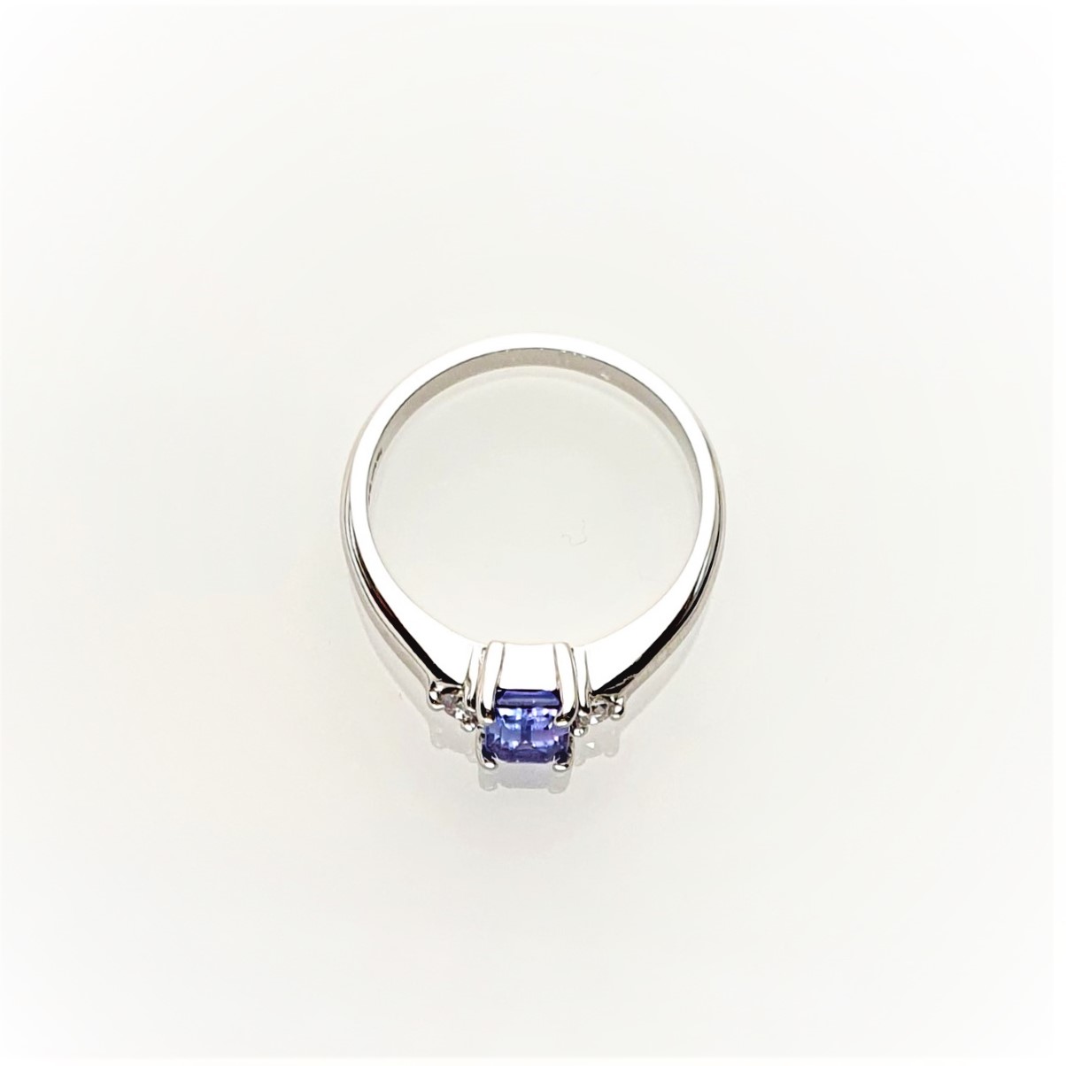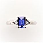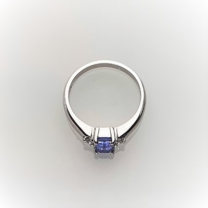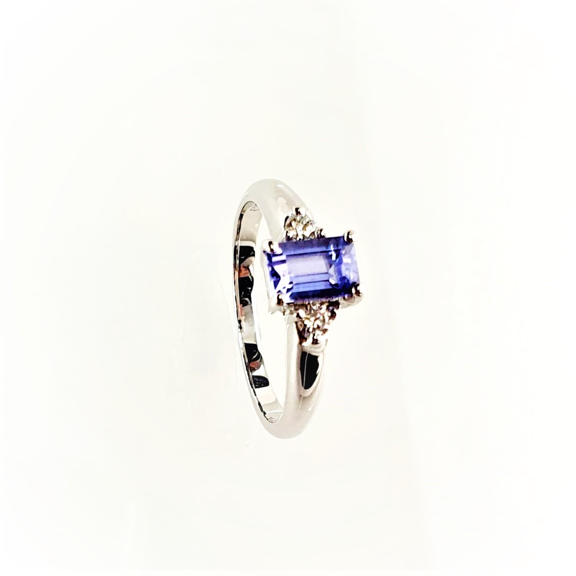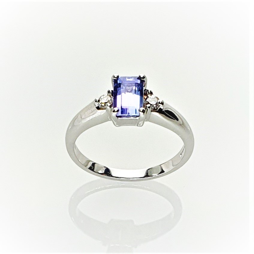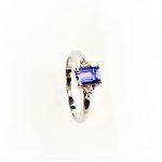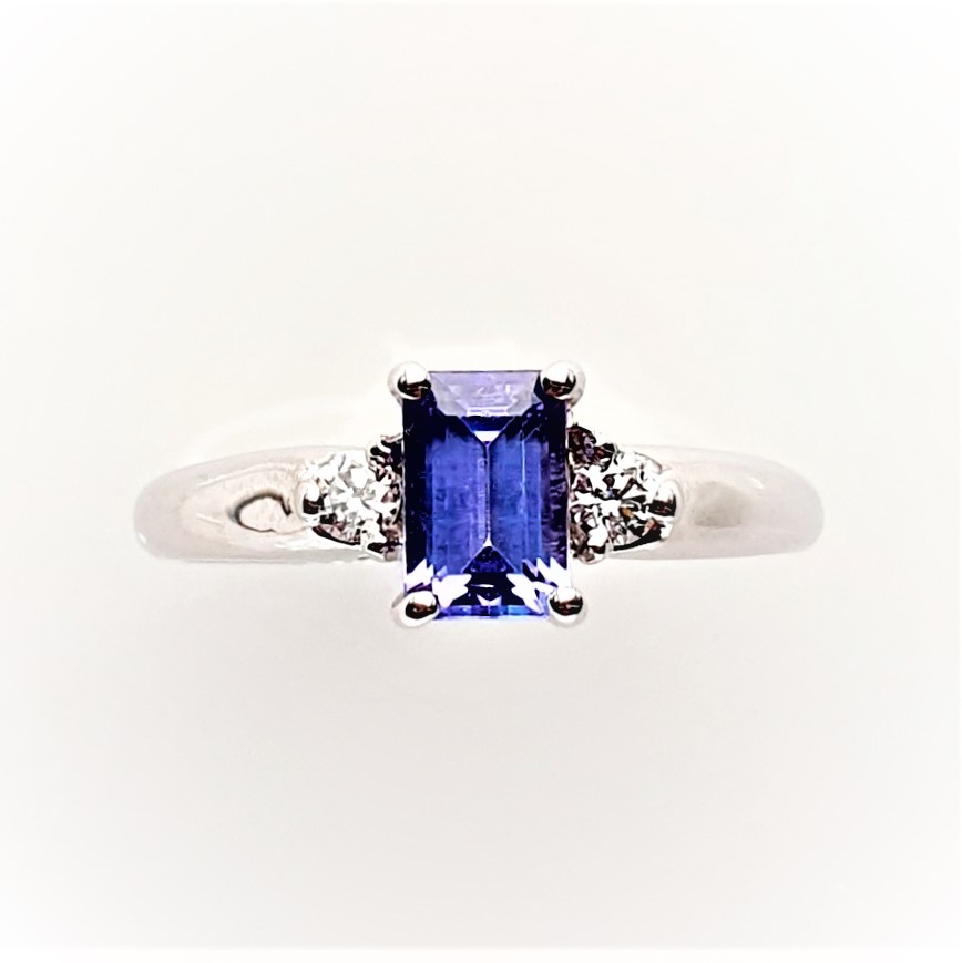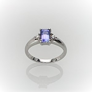One oval step cut tanzanite 6mm x 4mm. (also know as an emerald cut) and two round cut diamonds total 0.08ct.