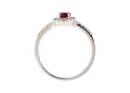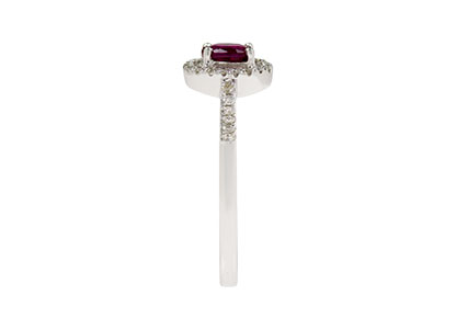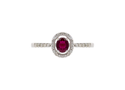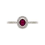 This beautiful oval ruby has been perfectly framed by an oval halo of twenty-nine round brilliant cut diamonds following on to the shoulders.