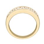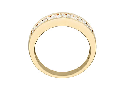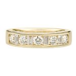 A modern smooth and tactile, 18ct yellow gold channel set half eternity ring, set with five round brilliant cut diamonds and four alternating baguette cut diamonds, chosen for their exceptional sparkle and fire. This mixture of the two contrasting cuts captures light from all angles which creates a dazzling display of sparkle and fire that will also capture instant attention.