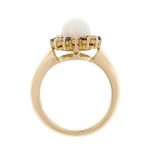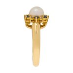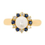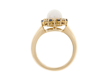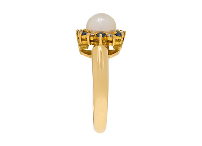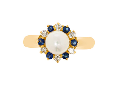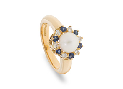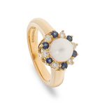 Crafted in 18ct yellow gold with a substantial shank, set with a single smooth round cultured pearl, surrounded with alternating blue sapphires and white diamonds.