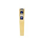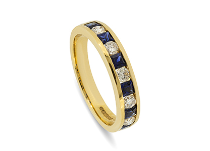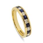 An elegant contemporary design, with a sophisticated style, this beautiful desirable ring is crafted in 18ct yellow gold set with six glistening square dark blue sapphires, divided and evenly spaced with four contrasting sparkling white round diamonds. This breath-taking ring will make you feel a million dollars every time you wear it.