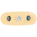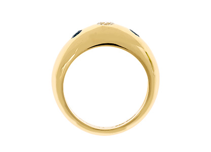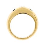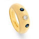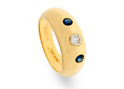 This gorgeous 18ct yellow gold domed band style ring, is invisible set with a single round brilliant cut diamond to the centre and a round brilliant cut sapphire to each side.
