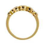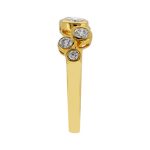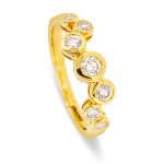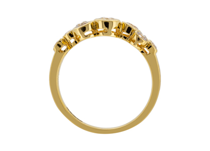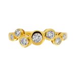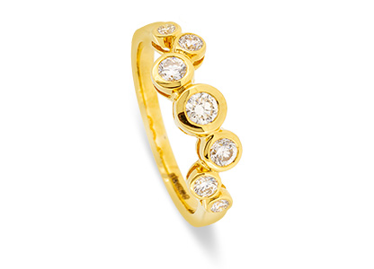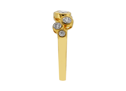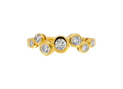 This fascinating 18ct yellow gold ring is a captivating and unique design, set with seven scattered round brilliant cut white diamonds of varying sizes. A ring with compelling luxurious appeal that will be adored for years to come, and is sure to become a favourite addition to your collection.