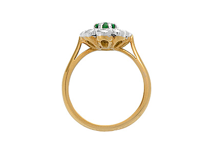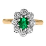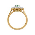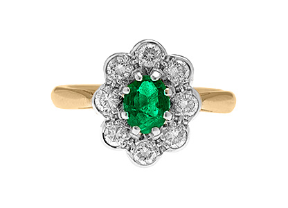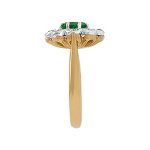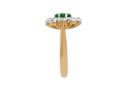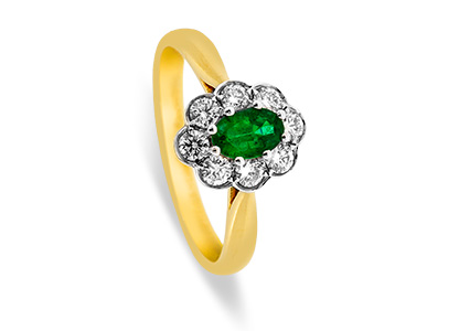 This delightful, 18ct yellow gold oval cluster ring has a gorgeous rich majestic green oval emerald set to the centre and framed by eight round brilliant cut white diamonds. An elegant vintage-inspired style of timeless quality crafted by hand.