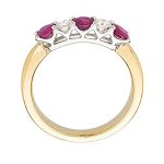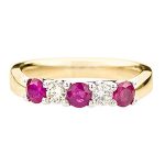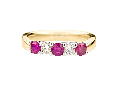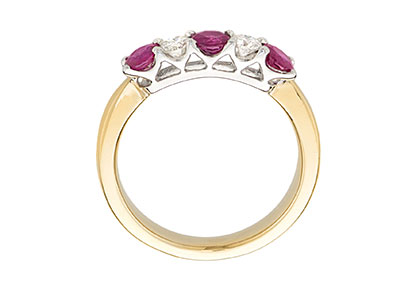 Luxurious and sophisticated with a distinctive style, this beautiful heavy 18ct yellow and white gold ruby and diamond half eternity ring, has an elegance that makes it extra special. Three beautiful round rubies with a contrasting round brilliant cut diamond set on each side of the centre ruby. A timeless classic style that will never go out of fashion.