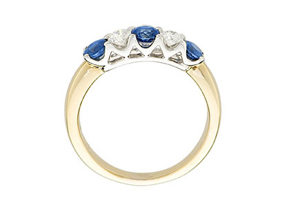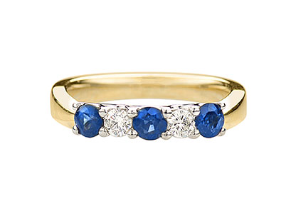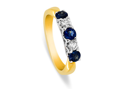 Luxurious and sophisticated with a distinctive style, this beautiful heavy 18ct yellow and white gold sapphire and diamond half eternity ring, has an elegance that makes it extra special. Three beautiful round sapphires with a contrasting round brilliant cut diamond set on each side of the centre sapphire, a timeless classic style that will never go out of fashion.