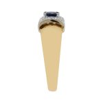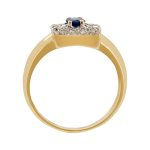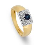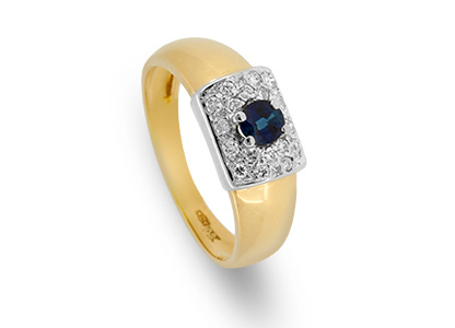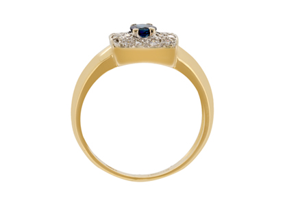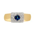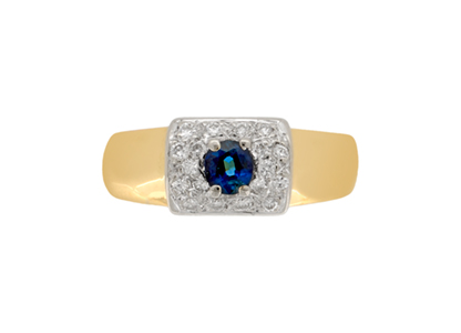 Made in 18ct yellow gold, with a white gold top that is set with a single round blue sapphire, encrusted with a white diamond surround.