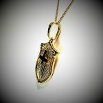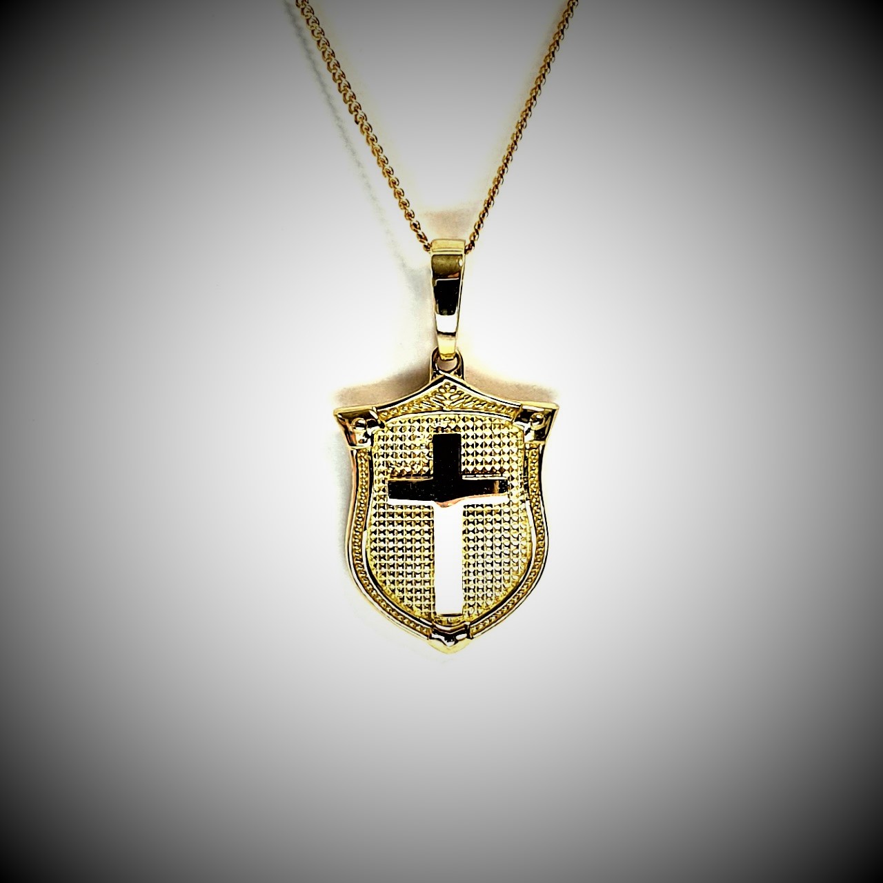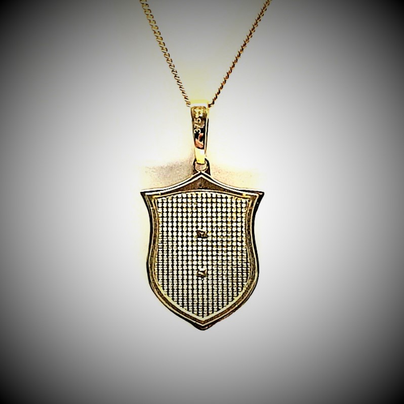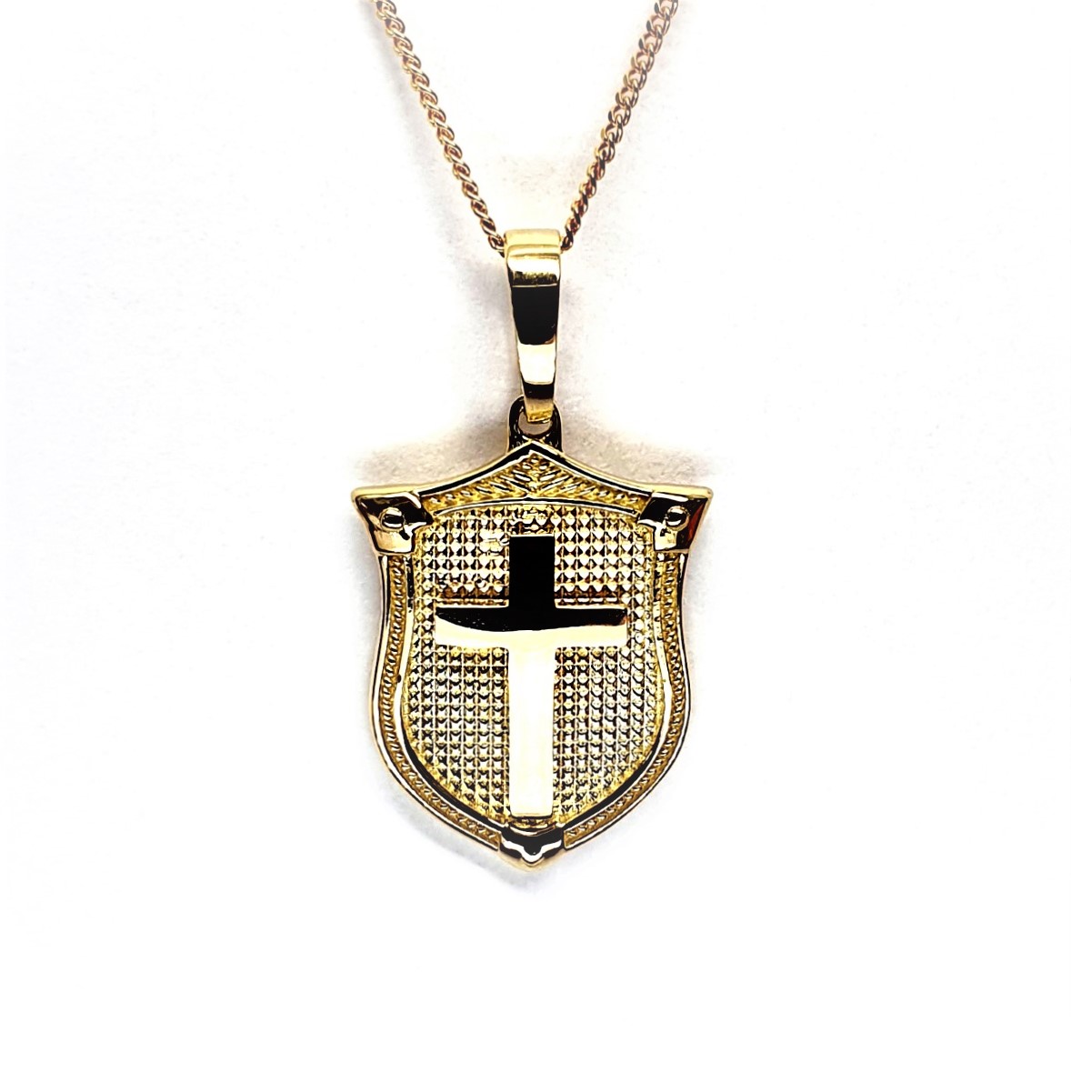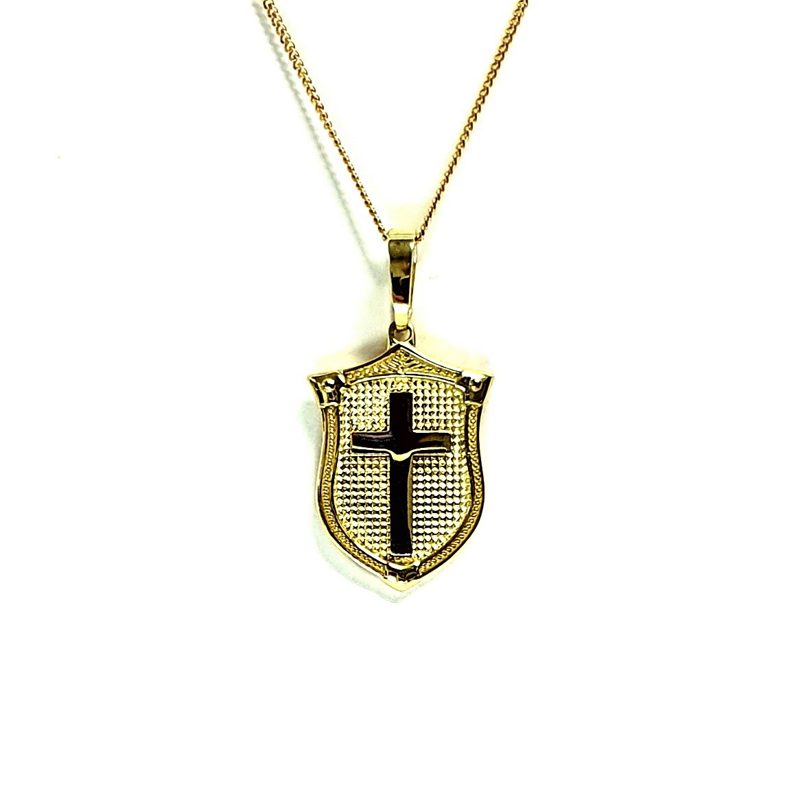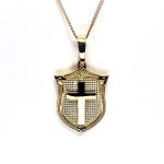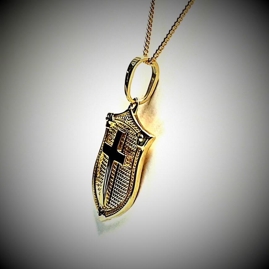 A unisex design meticulously crafted in 9ct yellow gold, an unusual combination of a cross laid on to a shield background, A symbol from the past often used in Heraldry.