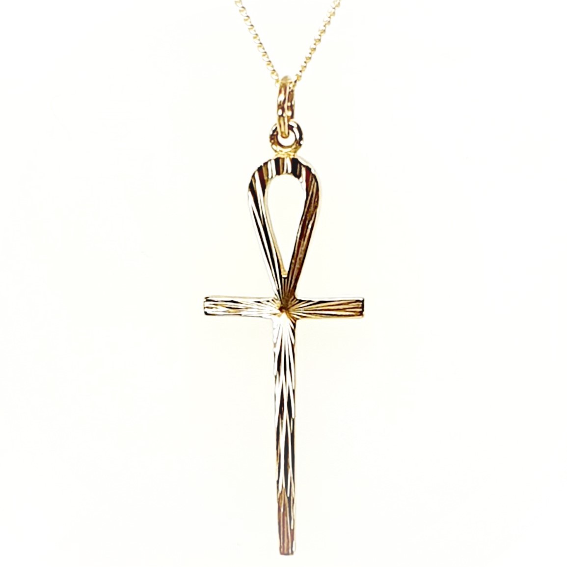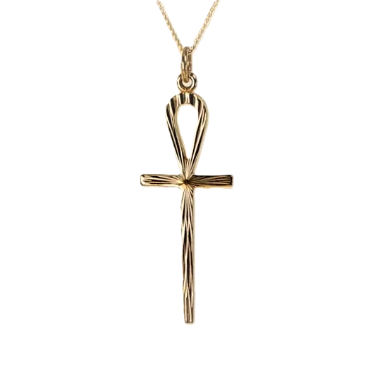 Elegant 9ct gold Ankh cross pendant with a hand-engraved starburst pattern. Measures 45mm x 15mm. Available with 16-inch, 18-inch, or 20-inch chains. Beautifully presented in a gift box.