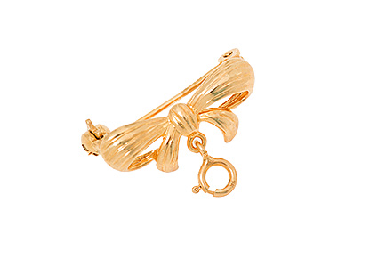 This classic petite 9ct yellow gold bow brooch is ideal for hanging one of our small charms or pendants from the clasp that is attached,.