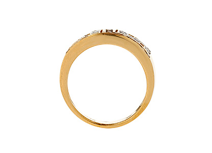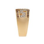 This unusual Greek key band ring measures 10mm to the front and tapers to 5mm at the back. It is made in 9ct yellow gold.