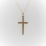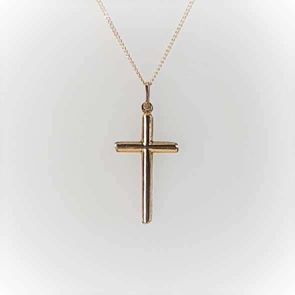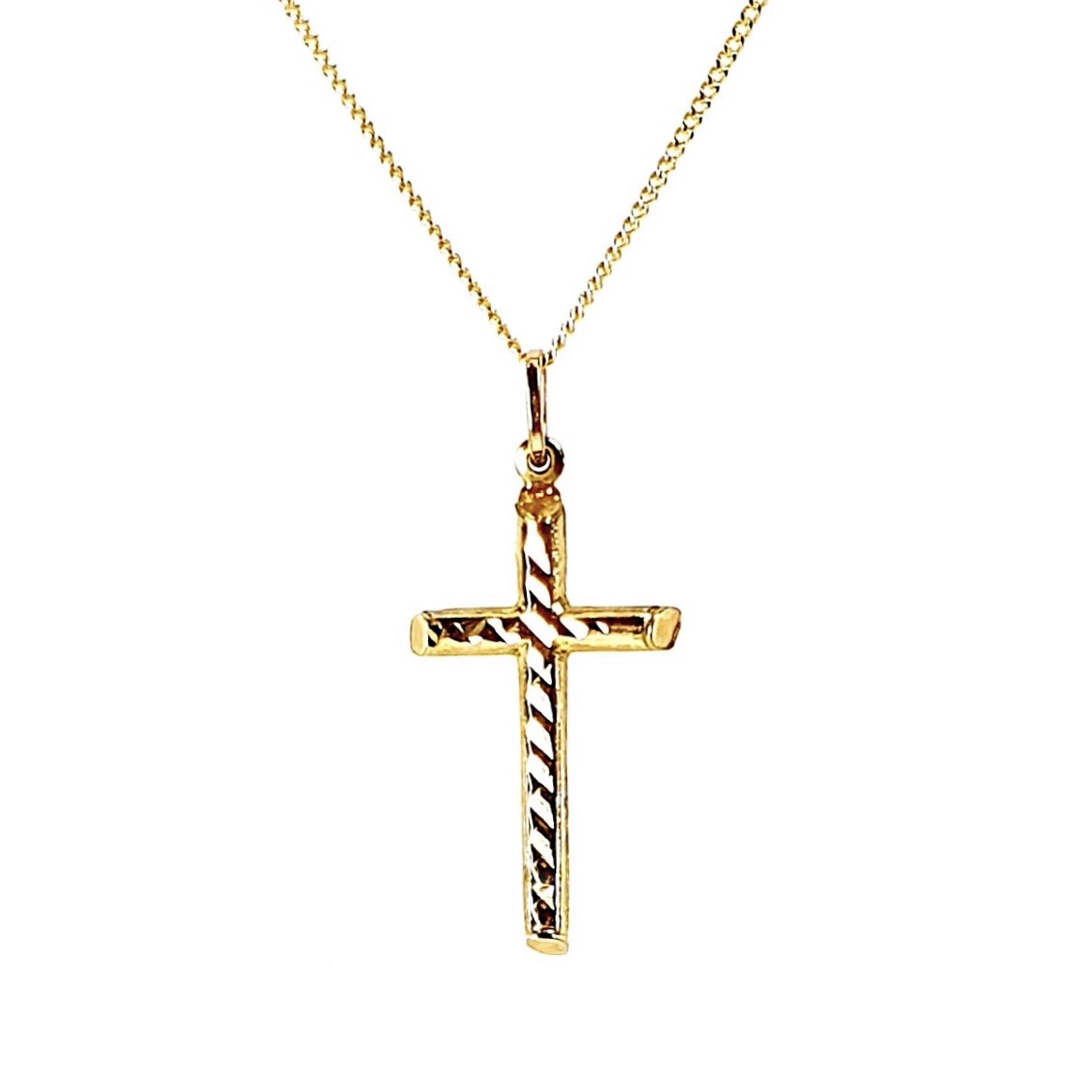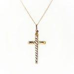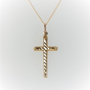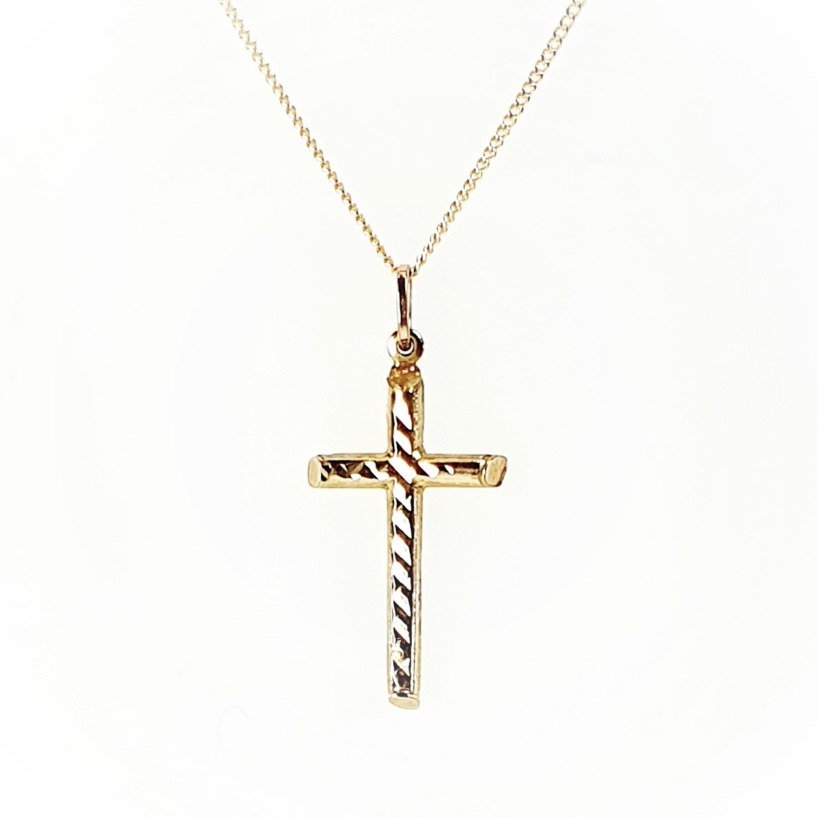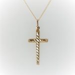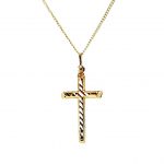 9ct gold cross pendant with hand-engraved tree bark texture.