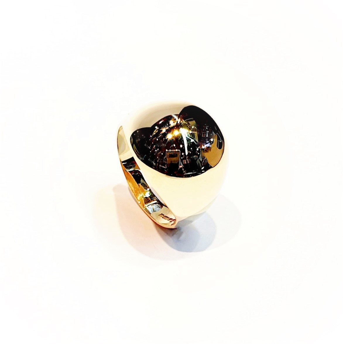 This gorgeous domed ring is made in our London workshop, crafted with a highly polished finish in 9ct yellow gold an unusual bold contemporary design that is sure to get noticed and turn heads with admiring glances.