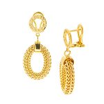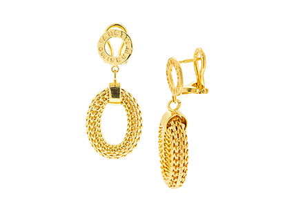 These unusual Italian drop earrings are embossed to the top solid circle with the words Fanctti Massimo and connected to the oval gold mesh tube to the bottom part, they have omega style clips with a straight wire for pierced ears.